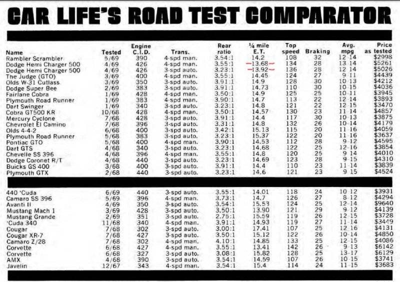 Car Life actually did test an A12 Super Bee about a month after the vehicles shown in that table (I was a subscriber back then). If I recall correctly, their test came up with a 13.8, fairly consistent with the other results. I remember well that it was faster than the Charger 500 Hemi automatic. During the period Bill Clark owned my GTX, he also had an A12 Road Runner, which his son ran a few times at the strip. He told me he ran high 13s with the car, which carried numerous weight adding power options not normally found on the factory platform. After Bill sold it, it had the rep of never getting beat on the street. Car is currently rotting in the backyard of the guy who bought it. The proverbial "I'm going to fix it up someday" from his son.I'll point out the obvious here: