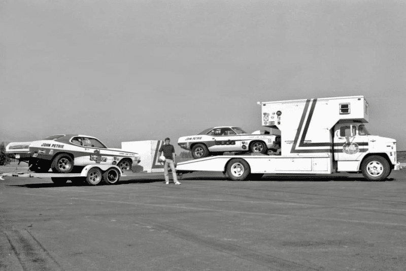 John Petrie's set up. He raced for Chrysler Canada, out of Toronto, much like Dick Landy and Sox and Martin did for Chrysler U.S.A. Neat "Swing Fender" Dodge transporter.