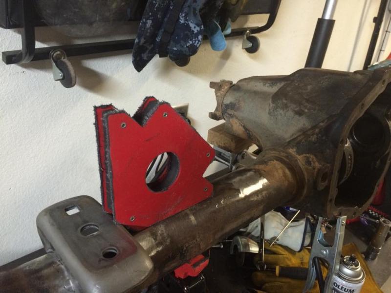 My goal while its out of the car though was to make the dana match the 8-3/4 perfectly, which while sitting on the floor, is 5* down (or up since its upside down) for welding. The best I can figure is make it match whats on the original axle and hopefully there will be enough adjustments with the RMS. With that I have to actually match the tranny because there will be no movement when the gas peddle is mashed, the axle should be "locked" at that pinion angle. Or as I understand it.