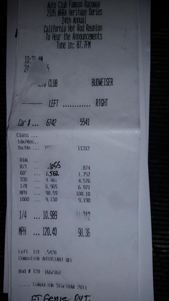 Here is my prized 10 second time slip....10.989...on the 5th run on my new setup....just hope to get it into the 10.80's. Will probably take me about 10-15 runs doing a little tuning each run....jetting first, then timing, then rear tire air pressure then launch RPM then Up from 100 Octane to 110 octane, in that order as I see it.View attachment 291896View attachment 291897Here is my prized 10 second time slip....10.989...on the 5th run on my new setup....just hope to get it into the 10.80's. Will probably take me about 10-15 runs doing a little tuning each run....jetting first, then timing, then rear tire air pressure then launch RPM then Up from 100 Octane to 110 octane, in that order as I see it.