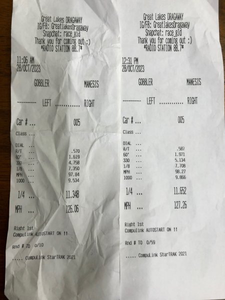 Pretty solid 60' ! Nice buildHere's my stock stroke build - 448/727-11" converter/8.75-4.10. SRP's in at zero deck, K1 H beams, 84cc eddy's - stock valve job with backcut intakes, I opened up the runners to 218cc's and skinnyd the bosses.. XE282S/1.6 mancini arms. Eddy RPM intake- port match, 850 quick fuel DP, 1 7/8" headers- open tubes. 71 Charger R/T - 3860lbs all up with driver. Hoping for 11s. 11.283@ 120.61.