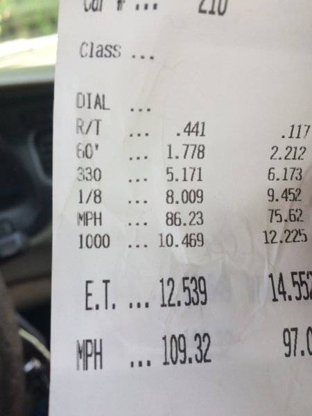 Drove it 200 miles round trip to the "MOPARS at Englishtown" show with intentions to just show the car but was wondering what it was running ,rented a helmet from the track and got a time runs in she ran 12.53 @109. no tuning just as I drove it there. 3/4 tank of gas, spare tire, tool box, cooler, folding chair and a classical guitar in the trunk "no kidding" lol was not watching the tach just shifted by ear.Think with some proper tuning and a gear change 3:73's there's a 11.99 in there ;-)