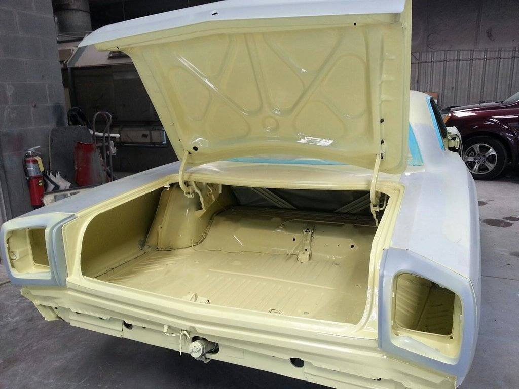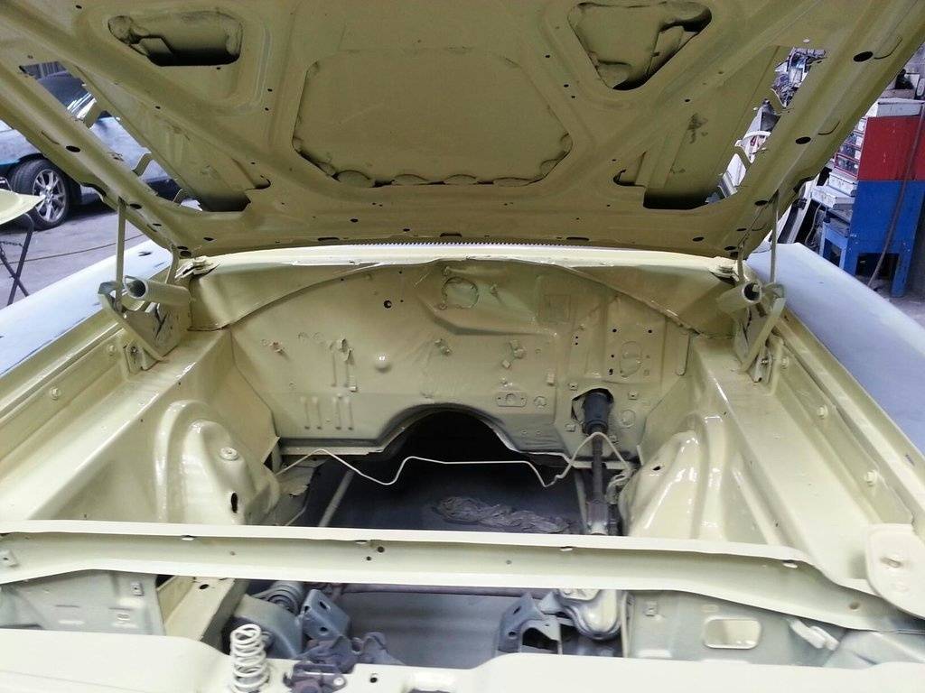 My pal has been busy. All the body work has been completed, engine compartment, under hood, door jambs and trunk area all painted. Exterior needs to be blocked and final sanded, then on goes the color.