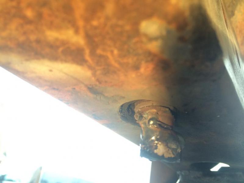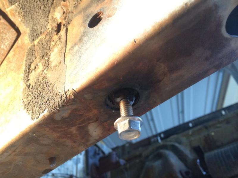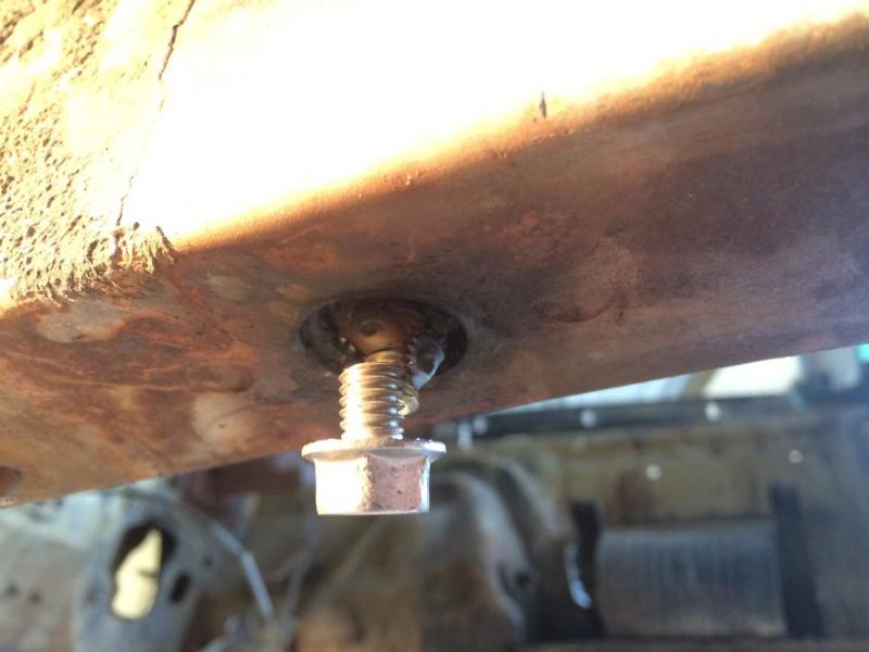 Well fellas I've got some bad news, after an entire frustrating day (10 hours of welding, heating, lube ect...) on one figgin bolt, I went against everyones recommendations and ended up cutting a window in the flat part of the frame. I concluded at some point in the past the bolt/nut were galled badly. The entire day I couldnt even get it to budge in either direction. Even with a 1/2 drive wrench before it sheared with heat and lube it didnt move a single bit loosening or tightening.