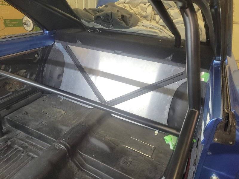 nice clean install tooThis is what I did in my Duster. The material is .033" aluminum. You need to seal the edges somehow. I'd use some sort of adhesive-backed rubber strip or something. Don't forget to make access holes if there is wiring that needs to run through it. I don't have a pic of it but there is another sheet on top of the package tray covering the speaker holes and defrost vent. I used 3M two-sided molding tape to secure the package try panel, that stuff is really strong.
