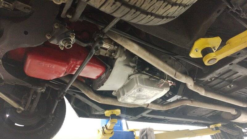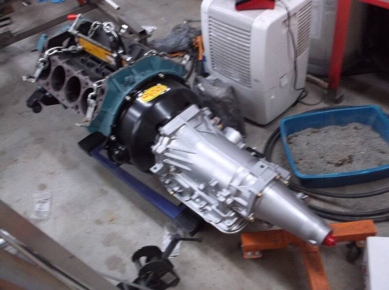 Here is my 4L60E being mocked up for motor and transmission mounts. It was built by Phoenix Transmission in Texas. It uses a Quicktime Adapter Bell Housing, so it is a 93 up General Motors transmission. Mine is built for about 550 horsepower. I asked Greg at Phoenix what we would do if it didn't stand up to the motor. He said if it failed just send it back and he would rebuild for 1000 horsepower. Yes, they can be built for 1000 H.P. I wanted the overdrive and lockup converter to help with gas economy, and this seems to be a good decision today.