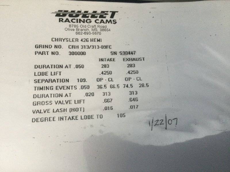 Whelp, a small update. Found the hard fuel line touching the exhaust. (NOT MY WORK). The fuel filter is just too close to the muffler. Knew it was like that. I also had a fuel pump by on the Racepumps.com on the engine. Barton told me to remove them as they suck. So putting on a new Carter and replumbing the the system. While doing this I removed the fuel pump shaft and noticed it looked like a shaft for a regular solid camshaft instead of a roller cam. I for some reason thought my engine had a roller cam. Looked in my folder I got with the car and came across the bullet cam card. Looked it up and it seems to be a regular flat tappet. Will call Monday to confirm but if true now I know why this thing is such a nasty bastard. I maybe changing cams in the off season as my belief is a roller is more streetable with the same specs…correct? Pic of cam card also and my Hemi is a 472 not big CID Hemis like many of you run. Thanks for any insight….Scott