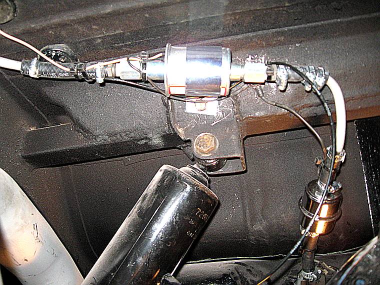 The pump was installed just above the right side shock mount. You can see the outlet is higher than the inlet. Plus I also installed a filter between the pump and the tank as recommended by Airtex. If that cross-member looks a little different than yours its because I added a 2x2 .120 wall square steel cross-member between the frame rails to strengthen that area because I'm running air shocks.... but that's another story.