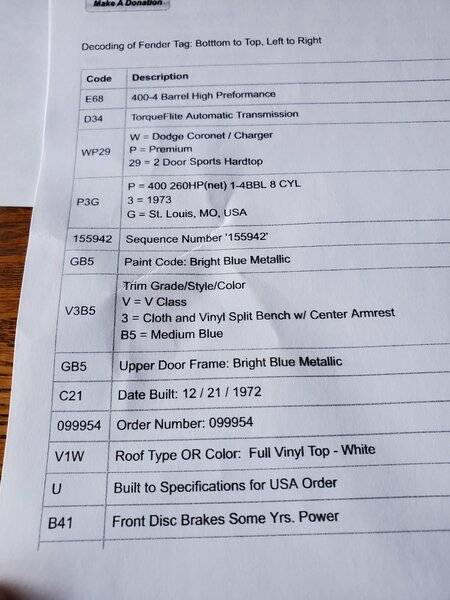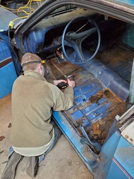 My son and I have tackled a 84 CUCV Blazer, he's 15, so now we're going after his second car a 73 Charger SE. He bought this one with his pizza shop job he works at after school. Quick story at how we got it was from a fb Market place add In Michigan...I am in York Pa...we struck a deal and he trailered it out a few days later. He gave us all the parts he collected and also the rear quarter steel that needed replaced. We hunted down a drivers front floor pan and rear trunk extension for the drivers side...still hunting the passengers side extension. He cleaned it out and started cutting the rusty drivers floor that needed to be replaced this morning. The new floor pan fits great but we're trying to figure out if the front of the pan is supposed to be bent 90 degrees where it connects with the floor under the pedals?? We have a clean title and decoded the fender tag. We do not have the original 400 that was in this but he did buy a 440 727 out of a 72 Winnebago a few weeks before so we got that covered. We'll probably do a basic rebuild on it and rebuild the trans since it has a parking brake drum on the output shaft...easy fix. This is a nice optioned car with AC PB PS...have to read the seat paper that's fallen apart to see what else is there. So we'll be on here a bunch documenting the process of making this his "fun car" as he puts it. I am a picture poster so if you like those you'll see plenty of them as this progresses.