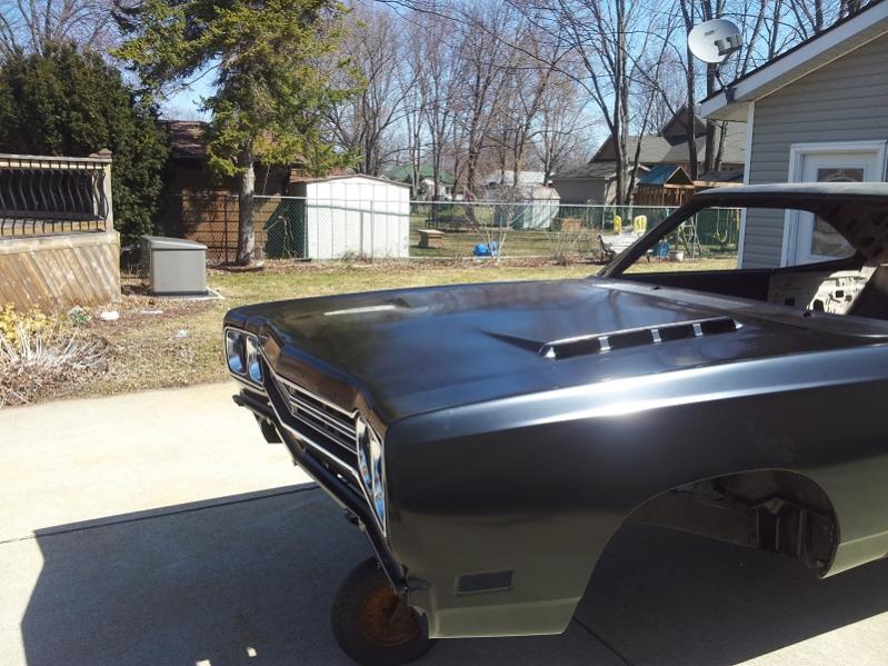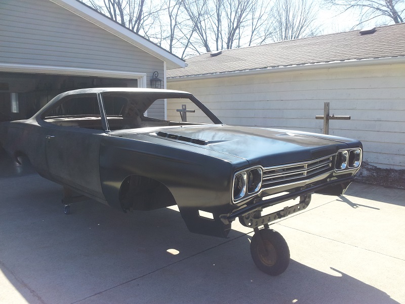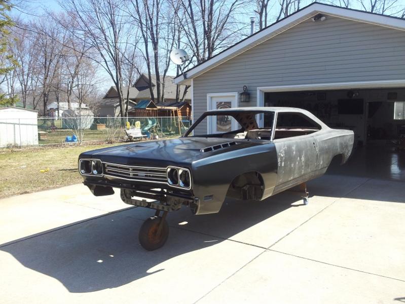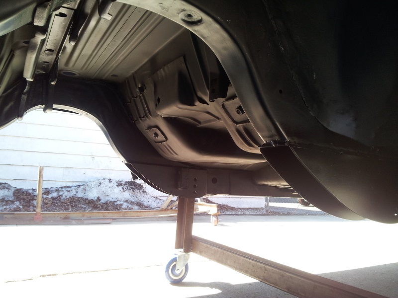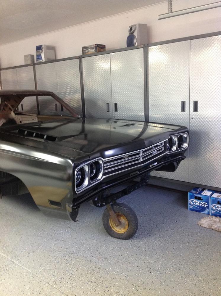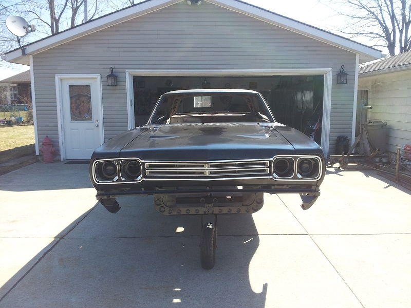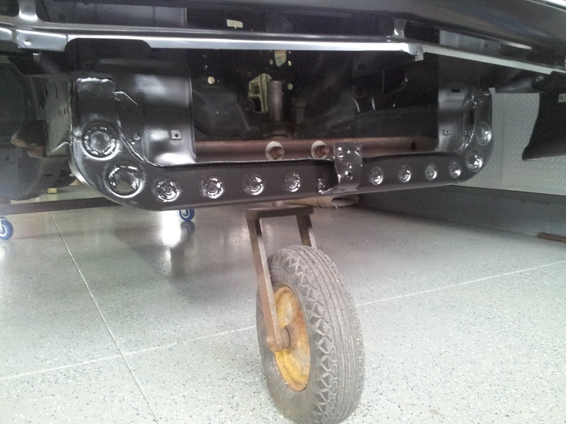 well, i installed the u.s car tool kit. fender bracing,tied the frames,rad support,torque boxes and moved the rear springs in. lot of grinding and welding but it turned out great, just laid the new fenders,hood and center grill in place to get a bit of modivation. here are some pics thx bruce