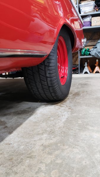 When I restored this car I went with disc front brakes,so 15" steel. wheels were powder coated and then installed with new MT tires. After ordering ....my dumb mistake is that no mopar dog dish will fit on these speedway steel wheels.