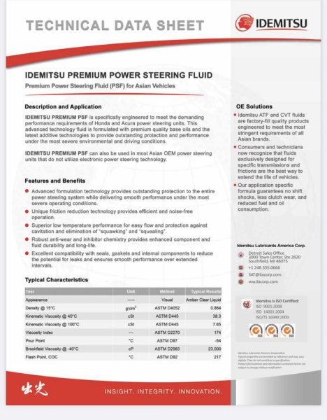 I have what I believe is a power steering fluid pump leak around the outside ring gasket area of the front face of my pump. I’ll probably just get a remanufactured. I used idemitsu fluid to fill have not run under power with car running. Do you think this fluid caused it? Pump is original and been sitting. So may have been faulty before. I’ll attach the fluid data sheet.