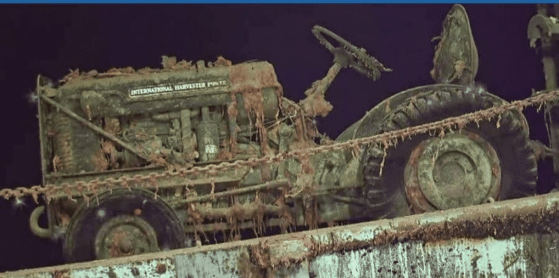 This is from the USS Hornet, which was destroyed in the Battle of the Coral Sea, laying in 17,500 feet of seawater. Notice this IH aircraft tug, still securely strapped to the deck. The hood decal is clear as when it was new. It looks like it could be cranked up and started as part of some weird deep-sea "will it start" video. The pressure obviously blew the tires out. Amazing preservation!