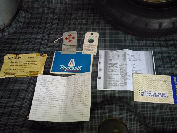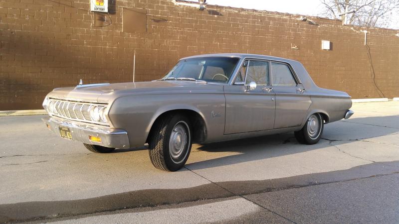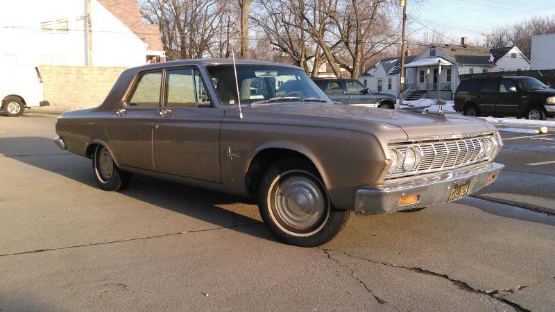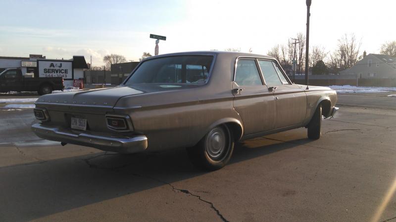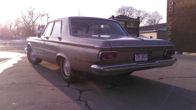 My name is Scott, and I just bought myself a 1964 Plymouth Savoy, all original from Riverside, CA. Family brought the car to Michigan, and sold it to me still under the original owners. Still has the same plates from when the car was sold new. Original paint; the driver's side quarter panel was repainted a long time ago in lacquer, and its has very minimal surface rust along a couple of the doors and one of the fenders, nothing serious. AM radio is out for repairs as of now. Original spare and jack have never been used and are perfect. just over 88k miles, documented to be original. 361 two barrel big block with A/C, PS, manual brakes. The car has the standard equipment rubber mat floor covering, styled to resemble carpet. Single speed wipers, no washer, no trunk light, no back up lights. Runs and drives like a dream. It moves effortlessly, and quietly. Excuse the grimy state you see, I had to take pictures as soon as I got it home. It will be rubbed out and thoroughly cleaned. The only thing the car needs for now is a full tune up, fuel pump, and to have the wheels repainted and to find proper dog dish hubcaps. Sooner rather than later I will opt for a power disc conversion, and swap out the open rear axle/springs for a sure grip and fresh leafs. Other than that, I can't see much else that the car needs. Dig the old Michelin Bias-Radials, which still ride quiet well.