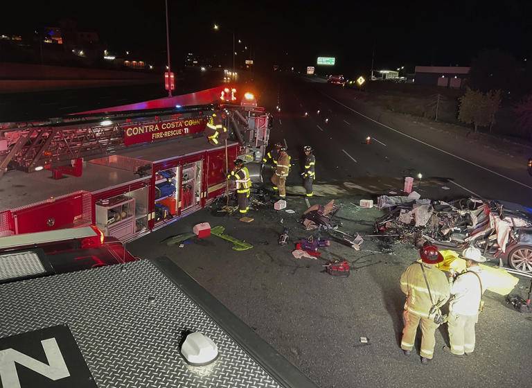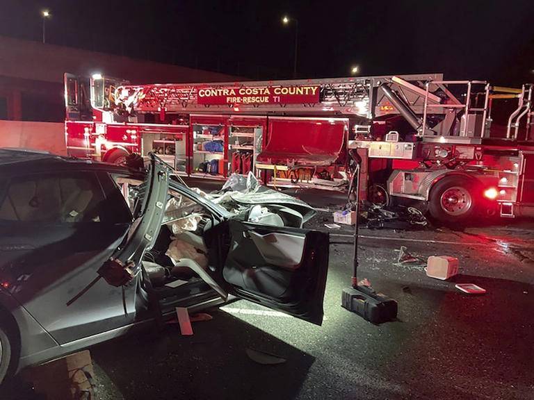 WALNUT CREEK, Calif. (AP) — A Tesla driver was killed and a passenger was critically injured Saturday when the car plowed into a fire truck that was parked on a Northern California freeway to shield a crew clearing another accident, fire officials said.
