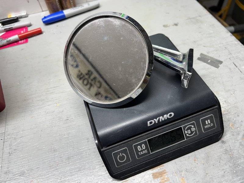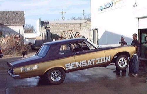 Aluminum parts; fuel cell & brackets, driveshaft, shocks, radiator, fan brackets (.030"), heads, seat brackets, wheels, front hubs, rotor hubs, calipers & mounts, motor mount (plate), trans shield, carb air pan (.030"), hood pins. Chrome moly tube; cage, steering column shaft, strut rods, center griile support. Carbon fiber; hood, scoop, bumper brackets. Lexan; 1/8" side and rear windows, 1/4" vent widows. Magnesium; seat frames (with foam and covers only, no springs), Parts removal; heater system, wiper sytem, stock wiring harnesses, window regulators, door inner structures, dash cluster, rear seat, leaf springs. Modified parts; K-frame (trimmed flanges, motor mounts, center), rear wheel tubs, cluster insert (1/8" aluminum), rear suspension (ladder bar and coil over). Heavy parts; iron Mega block (though it's been trimmed to 275lbs), truck Dana w/ aluminum girdle style cover, cast aluminum intake, cast aluminum valve covers, 2nd carb, stock steering wheel. Race stuff that makes it heavier; subframe connectors (2"x3"x1/8"), cage (also has 13 extra bars that aren't required for 8.50 cert), fire system (though it is all aluminum), tubes in the slicks. Except for the hood, the body, floor pan, frame rails are all factory steel including the bumpers. With the exception of the required safety gear and removal of the back seat, the interior and exterior appear to be an unaltered factory 64 Belvedere.