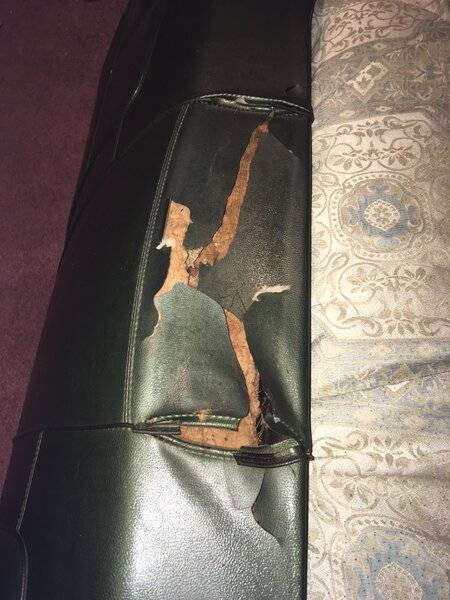 ON the top, seat back of the buddy seat there is an indent, from 25+ years of it being closed on a seat belt buckle, on the bottom is a small tear. After a few armor all baths, it has come back, lets say 70%+.