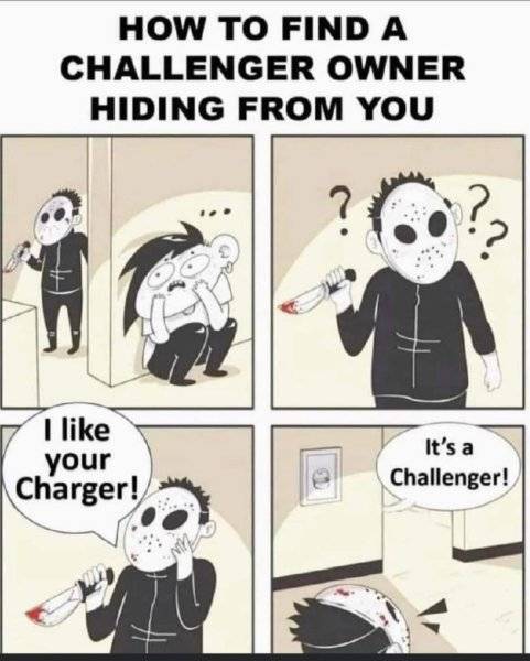 Love the meme,and the B bodies,but you need to reconfigure those Challenger lights to 1970 configuration! I did my wife's car years ago,I will be doing my car in the spring.