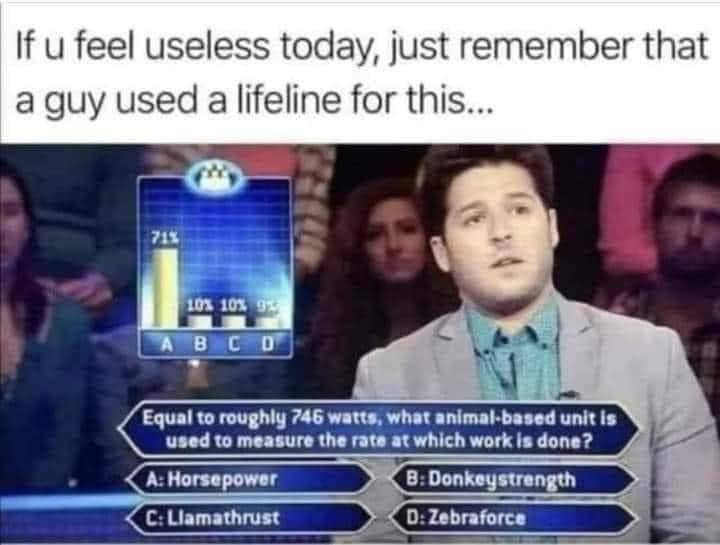 I think it would be fun to say that I have a 500 donkeystrength ( d.s. ) engine in my car!And almost 30% of the audience got it wrong too!!!
