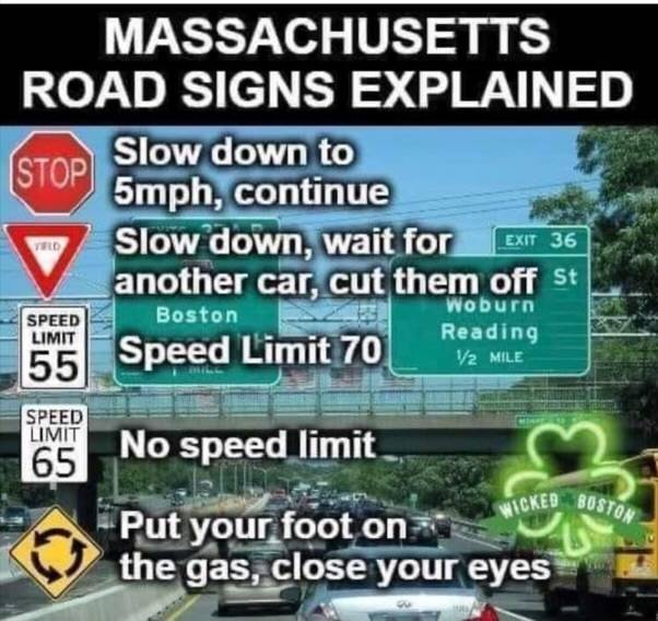 And don't, under any circumstances, signal your intention to turn!It's missing rules such as drive into Connecticut, cut-off CT drivers (in a New Jersey fashion), drive slow ( as in (Florida cotton top slow) on roads with 40-50 posted speed limits, and tailgate, tailgate, tailgate.