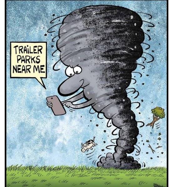 Reminds me of the old joke. What do a tornado and a hick divorce, have in common? No matter what, somebody’s losing a mobile home. I’m half hick, so no offense to any hick who, might read this.