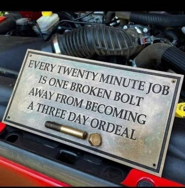 Oh man! That’s a bad day. I’ve had a few at work that made a quick swap into an all day ordeal with torches, drills, ez outs, and a good smattering of cursing. It’s always the one that’s hard to get to…Been there, done that. A broken alternator bolt that refused to come out, necessitated me to pull the top end of my 440 down, to swap heads side for side to give me a fresh tapped hole for a new bolt. Yeah, pretty well 3 days, plus cost of gaskets. Oh, also a one hour ride home on a flat bed.