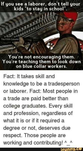 without people in "the trades" most collage grads would be f ed.....My opinion from my life's observations