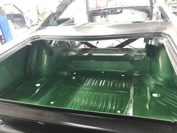 I did some minor bodywork in the trunk and underhood area,then they were sealed and painted with a single stage F6. We coated the trunk area with an F6 tinted bedliner if you are wondering why it looks like orange peel