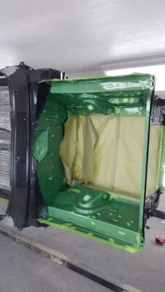 So we sanded the underside of the car,sprayed a couple coats of epoxy on it,seam sealed it and Brock undercoated it...sorry about the funny colors coming up on the one pic,some weird camera thing I guess