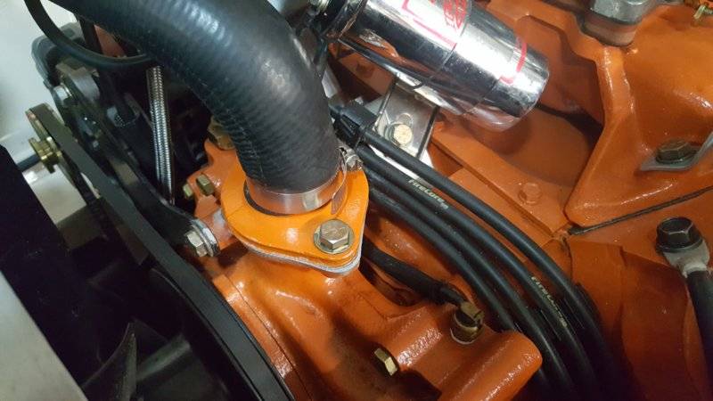 Flashpower o-ringed thermostat housing, black anodized. $34.50 Have them on all three cars. After awhile, you get tired of messing with a damn thermostat housing leaking or squirting antifreeze all over the your engine bay. Why did we never have these issues way back when?