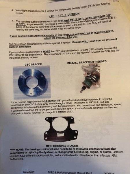 Its easier to mount the bellhousing to the trans on the bench to install the hydraulic bearing and the line and the plate. The bellhousing would not install flush to the mounting face of the trans. I used 80 grit Emory cloth to take some aluminum off the hole in the bellhousing to mount flush to the trans. The bearing cushion is specified by SST to be minimum of 1/8 to 3/8 inch.I think you lost me here when you refer to - " Had to take some metal off the bellhousing bore as it would not flush onto the trans. Had to use two 1/4 inch spacers to get the proper bearing cushion" - Could you expand on this explanation please. I'll be doing this conversion myself shortly and am trying to be as prepared as possible for any glitches.