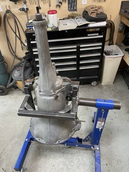 Keeping it simple, this has worked for me for 30 years of playing with 727's. Plenty sturdy, doesn't bounce, and full rotation. The threads for the bell crank boss is 3/8-16, so more than likely the same as you have in your engine stand already. The rear is just a piece of angle.I see plenty of bench and engine stand adaptable holding fixtures for gm transmissions. Is there a fixture designed to hold the 727 to make rebuilding much easier?