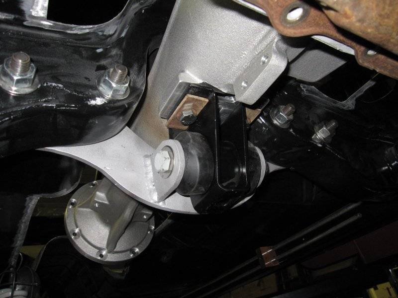 1965 Belvedere with maximum engine setback. I have a RMS front suspension but, the trans cross member doesn't know that! I used a later model spool trans mount with urethane replacement "rubber". 1/4" plate is the new cross member and front "washers". I used OEM bolts with flanged nuts (because I had them). I just used cardboard to make a pattern and torched it out. Pretty easy fab. I probably should have cut some lightening holes to reduce more weight.