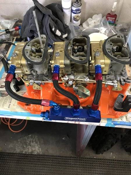 I don’t disagree with your thinking. So far I have all 3 new Holley 2300 carbs (325 cfm center and 2 350 cfm outboards) mech linkage, 1 side hung bowl, new Edelbrock intake, and an assortment of -6an fittings all in for $1500. That’s less than 3 new Mopar carbs and/or used ones that are risky and need rebuilding alone. 3 new Mopar vac carbs plus intake is over $2200.ABSOLUTELY TRUE.....words of wisdom....perhaps Sonny will rethink his position and just buy what he wants/needs and just enjoy the car and forget about trying to put "a square peg in a round hole" both literally and figuratively.....