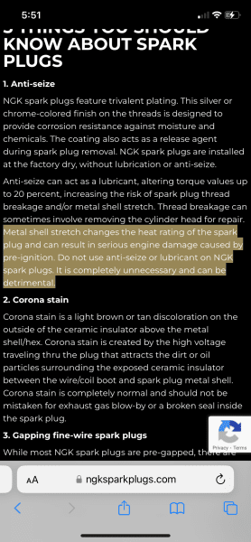 This is from ngk websiteI always antisense. Especially on plugs going in aluminum heads