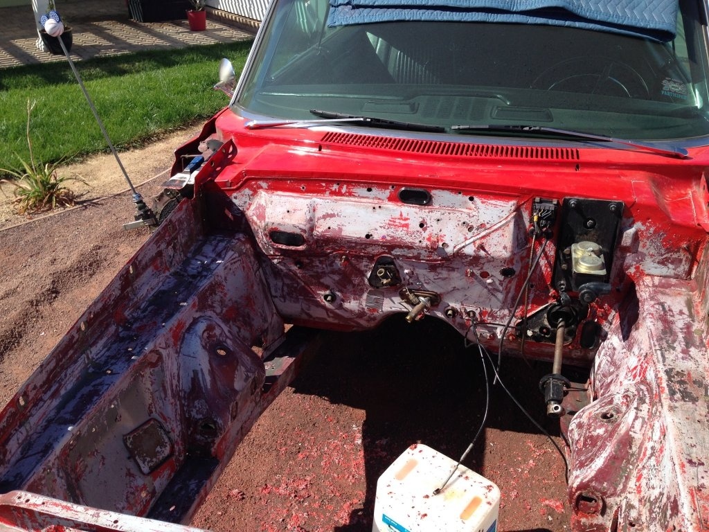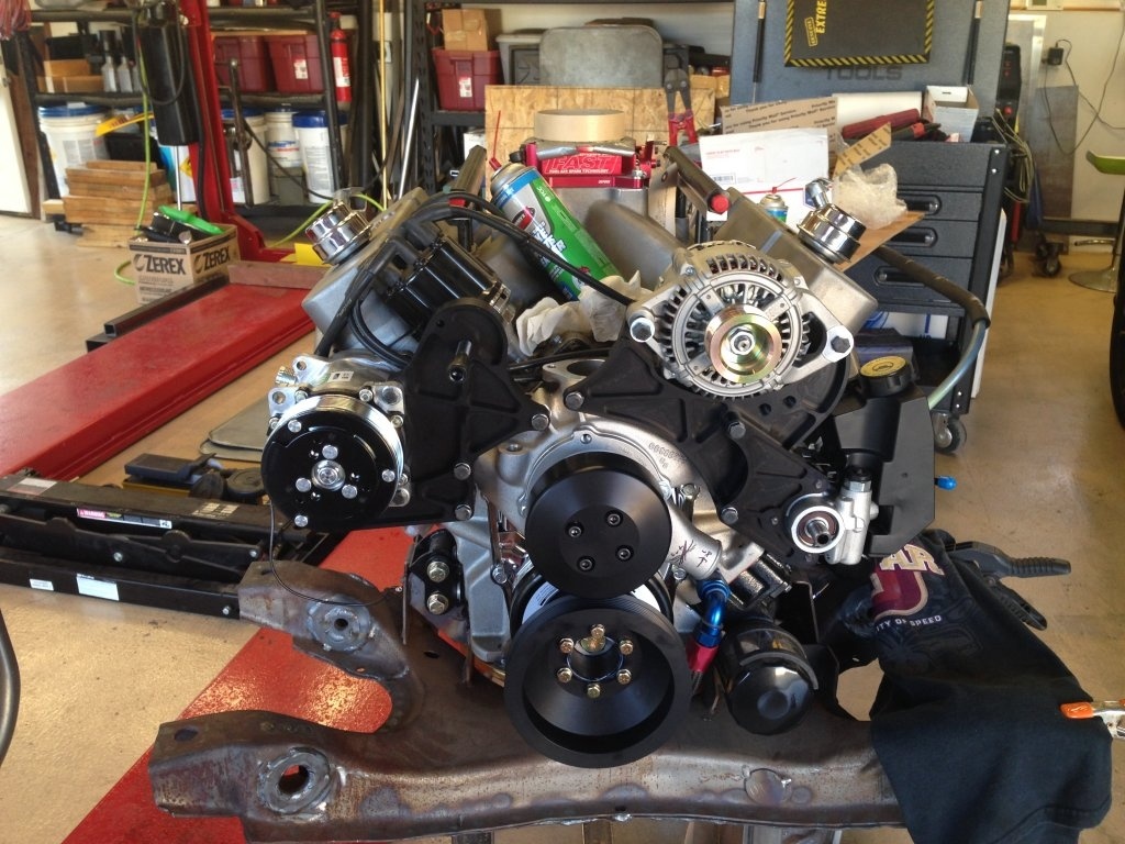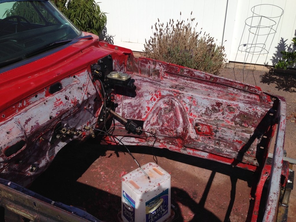 Got to hang out with the strippers today. Oops, meant stripper! I still have to use mechanical means to finish as the material I used was old. Can was still sealed up but was still lacking in some areas. No big deal. I read on the net that mastic and floor adhesive remover is supposed to be the bomb for undercoating. I will nab some tomorrow and hit the backsides of the inner fenders. They need to be cleaned off too for all the holes and repairs that will involve welding. Man there is a grip of holes to fill beyond just the firewall stuff. How do you like the "bigs and littles" going on with the tires? Shades of Big Daddy with his dragster. One of the layers of paint is the original color which is a burgundy of sorts. Think I'm staying with the Porsche red though. I also continued fitting up the SD Concepts front drive unit. The rest of the accessory units showed up today. I want to get that stuff fitted up before it ends up in the engine compartment. Much easier to deal with stuff when its on a stand and is easier to see and get at.