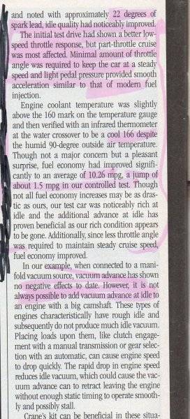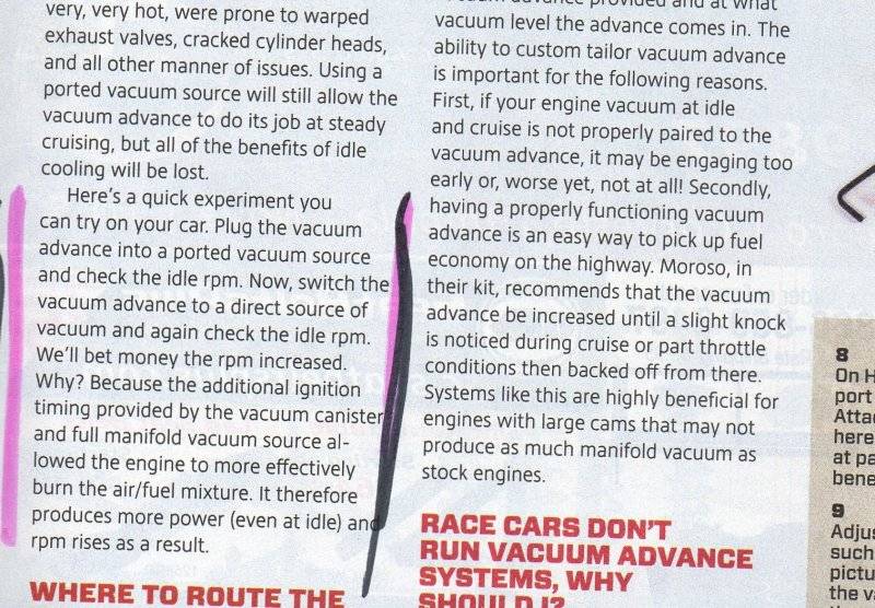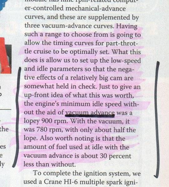 I think we are arguing the same point. That article on MVA is directed at stock or near stock engines with with little initial advance. The benefit of it being that they don't need to recurve their distributor and can still get more advance at idle. For those that build our engines and recurve our distributors, MVA is not needed.I ger it, you don't.