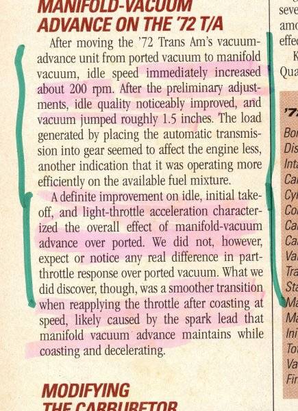 Ported vacuum advance vs manifold vacuum source for the distributor......too many "expert opinions" based on what????.....it's "my way is better than your way....because I said so".....or.......hundreds of engineering hours were spent on the development of the correct application for each engine application, albelt emission requirements or performance requirements.......let's see some real data not just unfounded speculation or the "shade tree mechanic" approach of guess and bygolly.......why not just recurve the mechanical advance and eliminate the distributor vacuum advance all together?????.........I'm drinking water, just not out of your trough. I'm still waiting to see why one is better than the other.