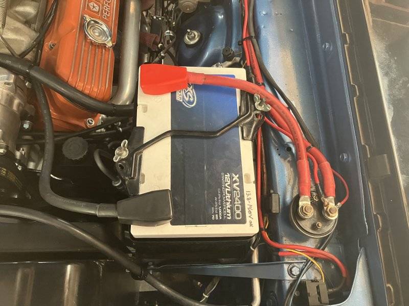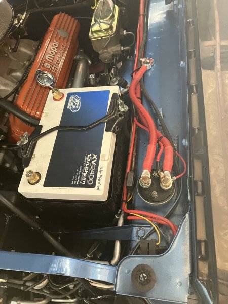 The battery hold down cross bar is held down by two J bolts. The one on the engine side is easy. The one to the fender apron is shorter but now I have the #8 hard line taking up some space. This battery seems slightly wider than others. It has a sleeve around it too. I slipped a rubber vacuum hose over the J bolt that attaches to the fender.