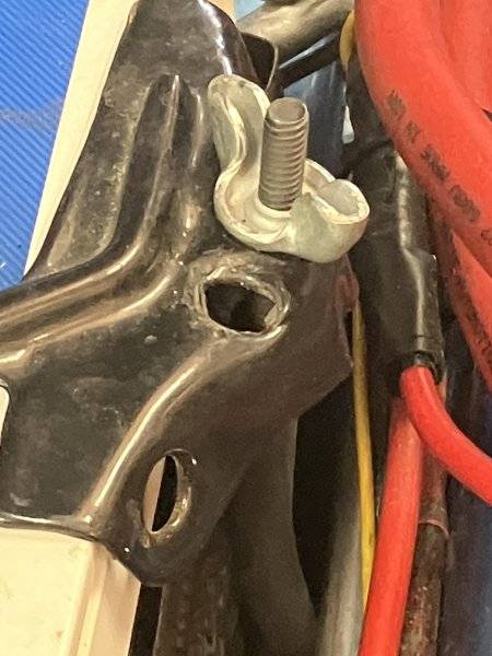 Not sure, but I think you have the apron side j-bolt in the wrong upper hole. Try the other one for better alignment? I might be wrong.Under hood wiring is done, battery is back in.