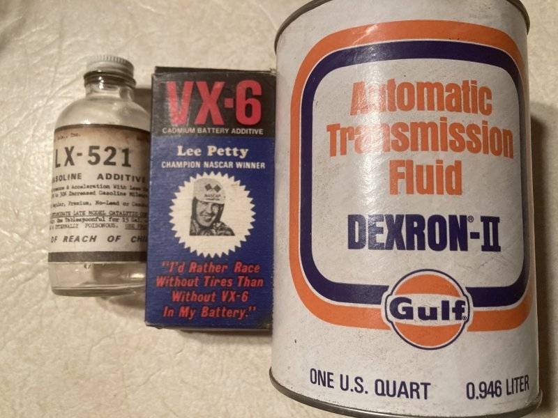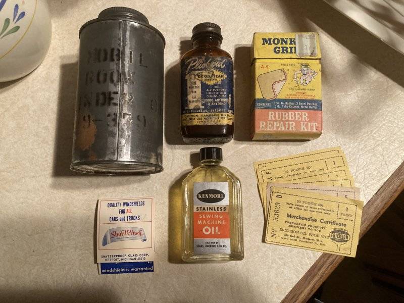 I can't find Pliobond anymore.......my favorite glue for fabrics, vinyl, and some rubber.A can of Mobil cylinder oil, some Goodyear glue, monkey grip patches from Kmart, some lens tissues from the shatterproof glass corporation, Kenmore oil, and some merchandise certificates from Erickson oil, in Hudson, Wisconsin, good until December 31, 1957