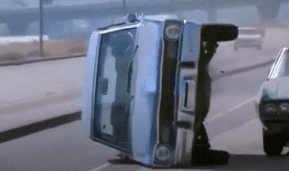 Here comes that same Blue 73 Duster. It looks like they used it several times with ramps attached to the back side so cars "rear end" it near the corners and roll over.