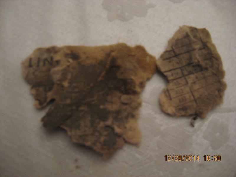 While the car was rolled on it's side outdoors in the bright sunshine, I started looking at the front end parts and describing to my blaster what I'd like done in this area of the car. I then noticed what appeared to be an original build sheet, tucked away inside of the driver's side front frame rail. I could see it through the frame rail holes, but I couldn't really get to it. So I removed the bumper bracket from the front of the frame rail, hoping to find a wide enough opening to pull the sheet out in one piece. But no luck.... The hole in the end of frame behind this bracket is only about 3/4" in diameter.