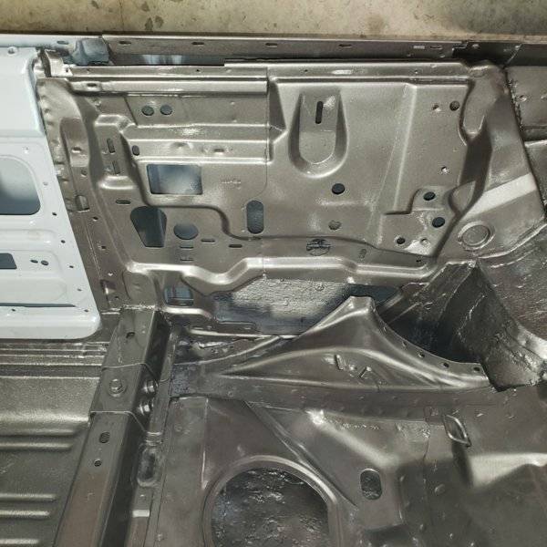 Been working inside the car, the bottom is done, and applying the bed-liner and paint to the trunk and cab area of the car . . .