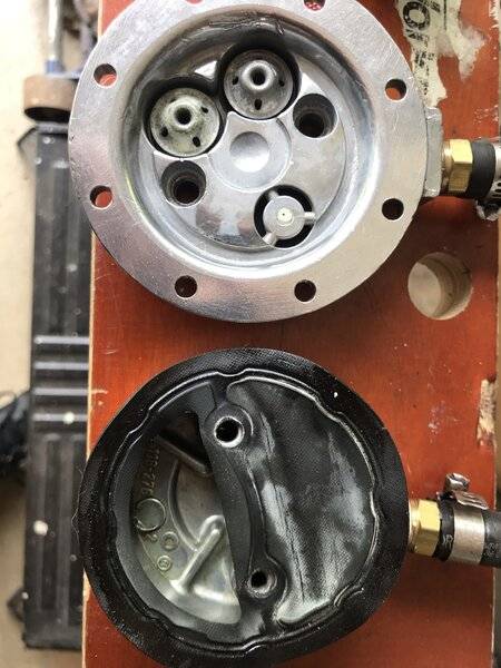 So I finally got some time to take off the fuel pump and opened it up (first time at this). Only thing I forgot was to take a reference photo for the orientation, shouldn't be to hard to figure out. Anyway I'm assuming this plunger seal looks worn enough so that it won't function properly. It's not separated or torn on the other side. There is a little bit of the small particals in the bottom section, but I don't think it's enough to mess it up. Nothing plugged. In the bottom seal you can see some of the grainy partical laying on it. I don't think this is a filter, at least not based on a couple of the rebuild kits I looked up.