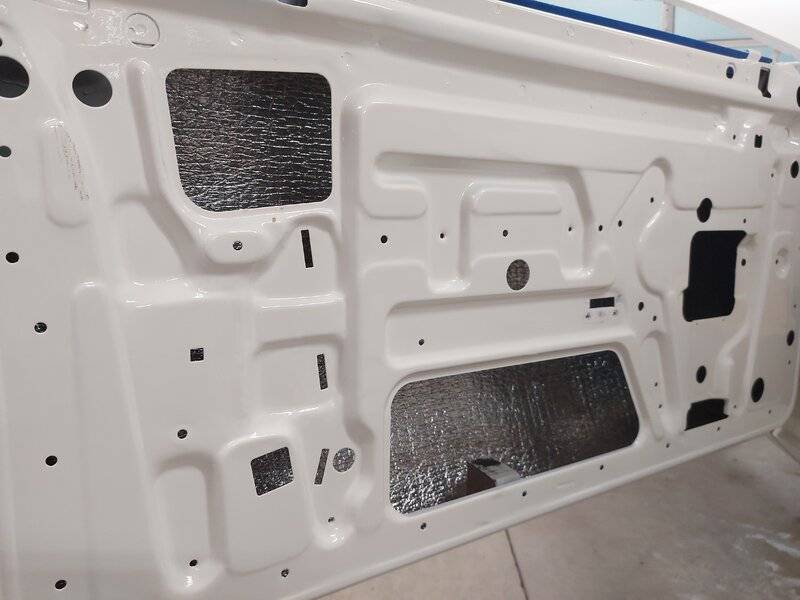 I highly suggest misting that with black paint, I can see my "tinfoil" though the holes in my headliner.Installed some sound deadener in the doors and installed some heat shielding on the underside of the roof.