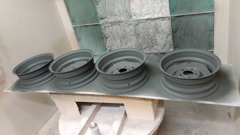 What better time than a shutdown week to borrow the spray booth at work to finally get the steelies done the right way. Had them blasted to bare metal, after that I etch primed, filler primed, 3 coats of Shop-Line JB MM1 Turbine Bronze base (Ditzler 60492), 3 coats of Shop-Line JC630 polyurethane clear and voila, lookin better than ever. Bought a new inexpensive hvlp gun for this job. Worked out great. Do you need to spend a lot on a high end gun to get really nice results? No. If I ran a shop that I relied on my gun to earn a living? Then yes. All depends on your situation.