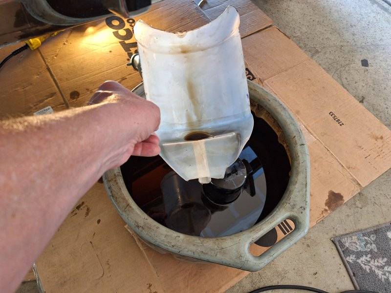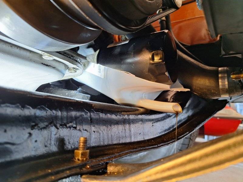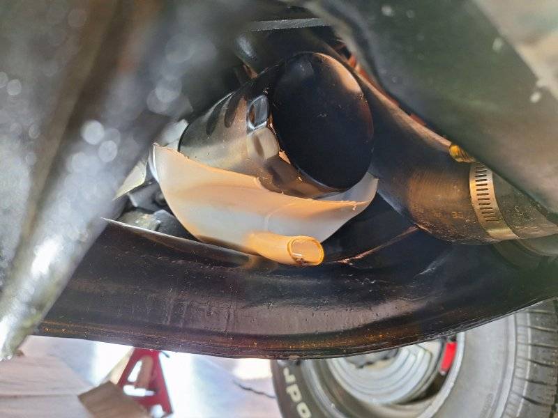 You sure have more room there without a sway bar in place.Changed the oil and filter on the Coronet. Pretty routine, but this time I used a homemade funnel for the oil filter, the idea was pilfered from a @dadsbee thread. Cut a plastic jug in half and placed it under the filter. The hollow handle makes a perfect spout. No more oil spilled on the K-member.