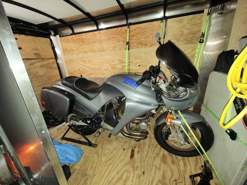 I'd serviced it 10 years ago (how I know it hadn't gone a mile since). Checked my adjustments. Rebuilt both brakes and both master cylinders. Installed upgrades from an identical bike I wrecked (damn deer) 4 years ago - heated clothing pigtail, HID headlight, LED taillight with brake light flashers, new turn signals, LED voltmeter, battery tender harness, Buell factory race ignition box (different advance curve, higher rev limit), additional saddlebag mounts for more support, storage tubes under the bags for med supplies and a spare fuel bottle - pressure washed everything with the bodywork off, set tire pressures on the zero mile tires...and went for a spin.