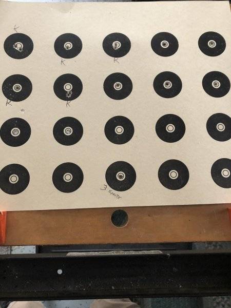 Answer me this fellow FBBO members: Why did @oldbee put old 33 1/3 records on a piece of paper??Super Bee still not home. Soo, it’s off to 50ft indoor shooting. Zero in Kimber 82G from 100yds and my unlimited from 50yds. ‘K’ is the Kimber. Lowest bull is 3shots from the unlimited. VERY happy.